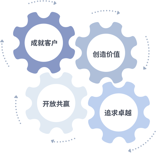 成就客户是一切决策的出发点,创造价值是衡量所有工作的标准,追求卓越是腾龙集团做事做人的态度,开放共赢是腾龙集团的格局也是最终的结果。价值观的齿轮环环相扣,推动着组织里的每个人不断向前。